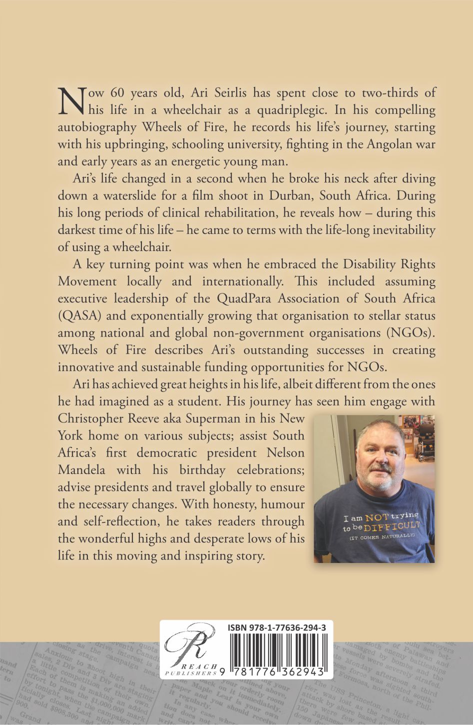 Ari Seirlis, now 60, has spent nearly two-thirds of his life as a quadriplegic, a reality that began when he broke his neck during a waterslide film shoot in Durban, South Africa. In his autobiography, Wheels of Fire, he recounts his journey from an active young man—shaped by his schooling, university years, and service in the Angolan war—to facing the life-altering consequences of his injury. Through long and difficult rehabilitation, he came to terms with his condition and found new purpose by embracing the Disability Rights Movement. His leadership in the QuadPara Association of South Africa (QASA) helped the organization achieve national and global recognition, driving positive change for people with disabilities.